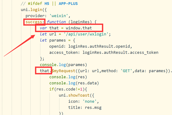 3,在使用uni.xxxxx的回调方法(success/fail)内,首行增加var that = window.that