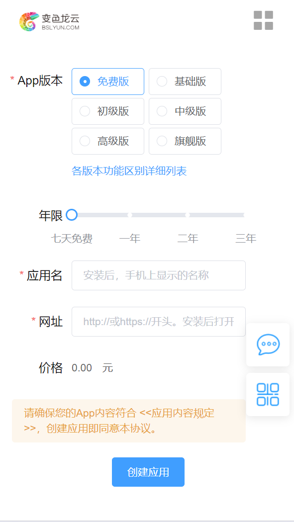 选择App版本,输入姓名和网址。点击【创建应用】。【订单支付】等待创建完成应用。